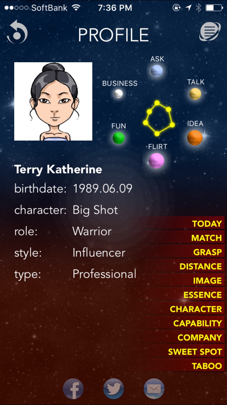 You can read characteristics analysis of each friend. It contains advices on "understanding how he/she views the world" "how to avoid uneasy situations with him/her" and so on. The language is available in both Japanese and English. (Please set your device's default language appropriately)